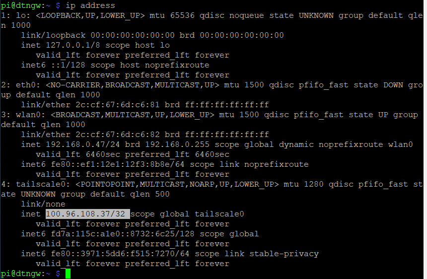 After your node will be successfuly added to the TailScale network, you can check your local ip address using a command: